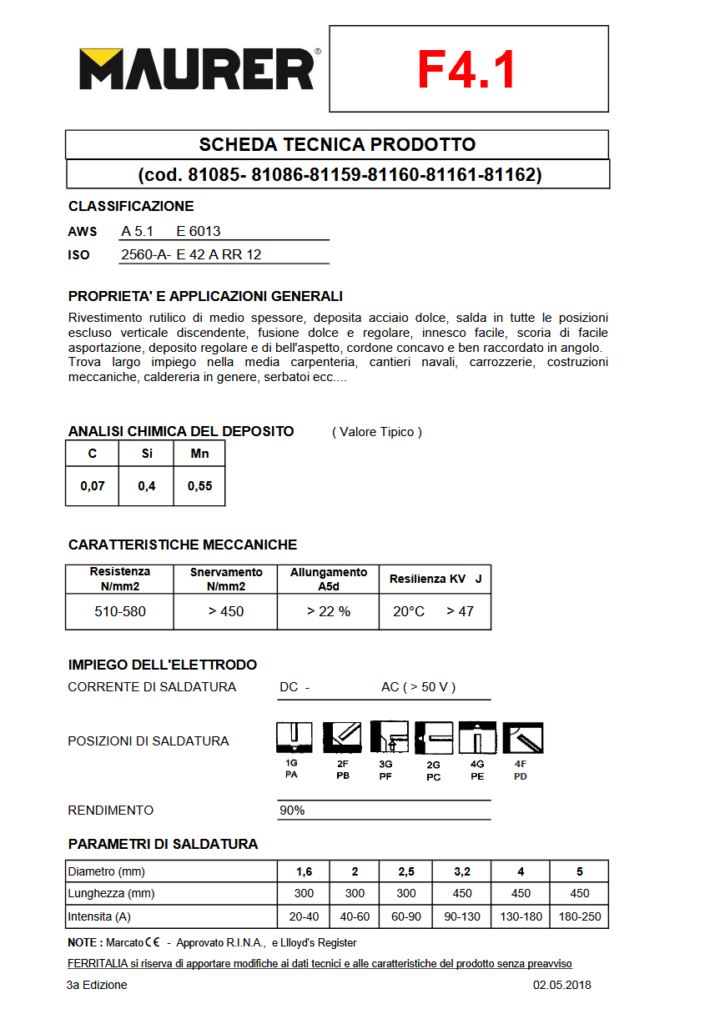 - Rivestimento rutilico di medio spessore, deposita acciaio dolce, salda in tutte le posizioni escluso verticale discendente, fusione dolce e regolare, innesco facile, scoria di facile asportazione, deposito regolare e di bell’aspetto, cordone concavo e ben raccordato in angolo.